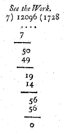 qui indique la division de 116 par 36 soit en notation euclidienne : 116 = 3×36 + 8 (le reste n'est pas indiqué) - Autre exemple : Arithmetick par John HILL (1772)